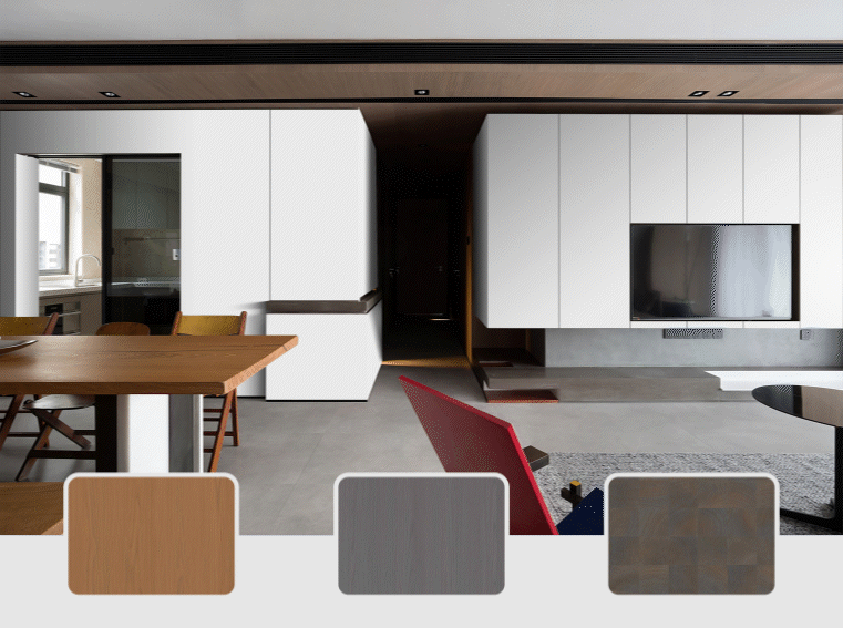 Explore a wide range of laminate finishes designed for interior furniture and surface applications. Instantly apply designs to interior elements and understand how textures and finishes interact with real-world spaces.